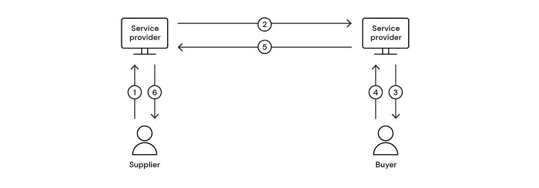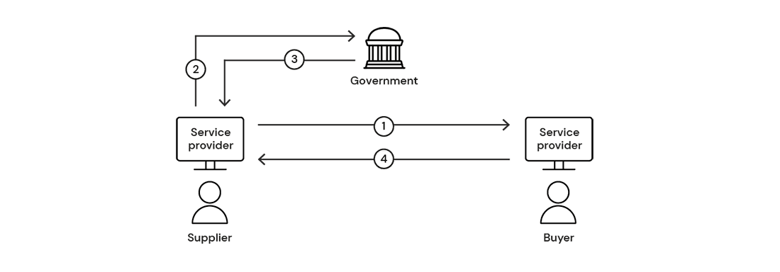 Also called a 4-corner model, the main particularity of interoperability is that taxpayers use a service provider to exchange e-invoices. Moreover, service providers can agree amongst themselves which formats to exchange, resulting in open networks with many interoperable formats and service providers.